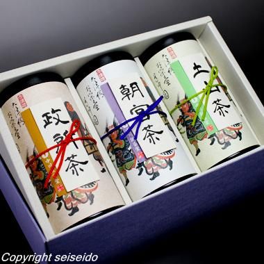 朝宮上煎茶180g、土山上煎茶180g、極上政所ほうじ茶、70gを大津絵お茶壷道中缶にお詰めしました。